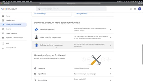 Once you sign into your old account, you visit "Google Account Settings" by going into the top-right corner and clicking onto your icon. From there, click on "Google Account." This will lead you to a page with all your account information. You'll see tabs on the left side of the screen. Click on "Data & personalization." Select the "Download, delete, or make a plan for your data panel" tab and then click "Delete a service or your account." This will prompt you to log in again and then go to the "Gmail" option and click "Delete" along with the trash icon. After that, just follow the instructions on the screen.