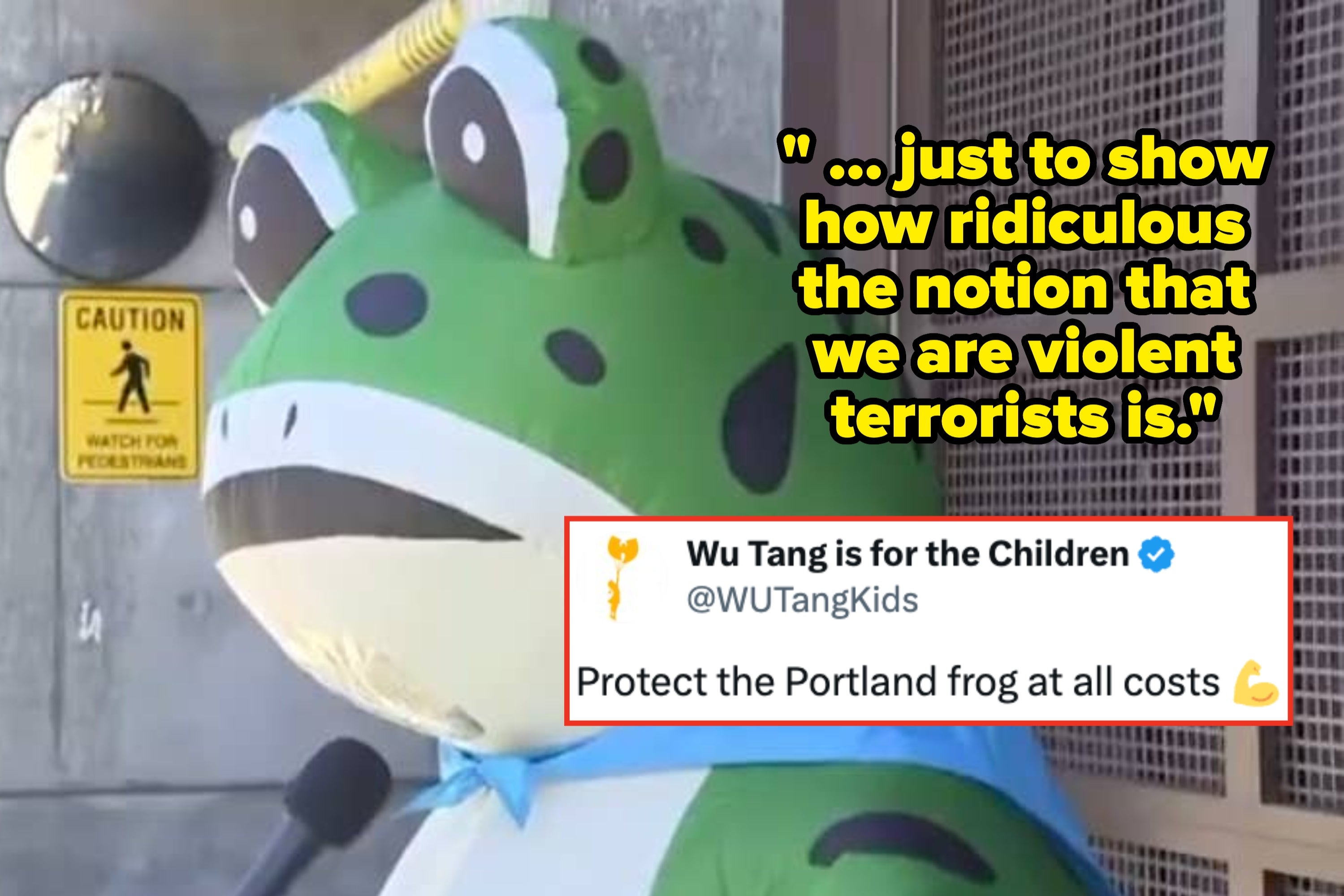 "So, I'm out here protesting in a frog costume — especially in a frog costume — just to show how ridiculous the notion that we are violent terrorists is."